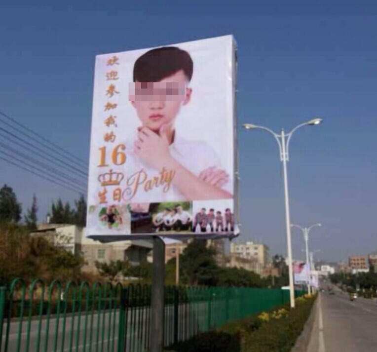 “#欢迎参加我的16岁生日party# 在晋江看到的,有钱真是这么任性啊!”12月16日下午,这条微博引来不少网友的围观。微博配了4张晋江一条路上广告牌的图片,广告牌上是一个可爱小男生的照片,照片旁配了文字:“欢迎参加我的16岁生日party”。