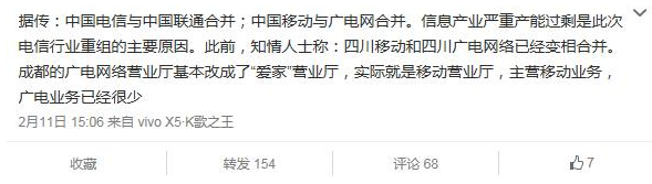 昨日下午,《移动信息》杂志在官方微博上发布消息:“据传:中国电信与中国联通合并;中国移动与广电网合并。信息产业严重产能过剩是此次电信行业重组的主要原因。此前,知情人士称:四川移动和四川广电网络已经变相合并。成都的广电网络营业厅基本改成了“爱家”营业厅,实际就是移动营业厅,主营移动业务,广电业务已经很少。”