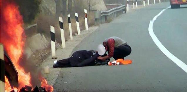 1月5日,青银高速山西汾阳段,一辆小轿车侧翻在路旁的排水沟里发生自燃。车后20多米处,一名伤者躺在冰冷的地面上,浑身颤抖。接警赶来的交警查看伤情后,将自己的棉大衣脱下盖在了伤者身上。