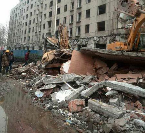 “它是等着大钩机推倒后再上去工作的。”据现场一名工人介绍,事故原因是施工失误,“操作可能不规范吧。”