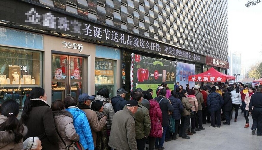 2014年12月23日,郑州二七路一珠宝广场,200多位市民排起了数十米长队,拿着苹果等待换黄金。据介绍,为了迎圣诞节,凡持一对苹果到金鑫珠宝正弘店,即可免费兑换迷你“招财金”小金条一个。